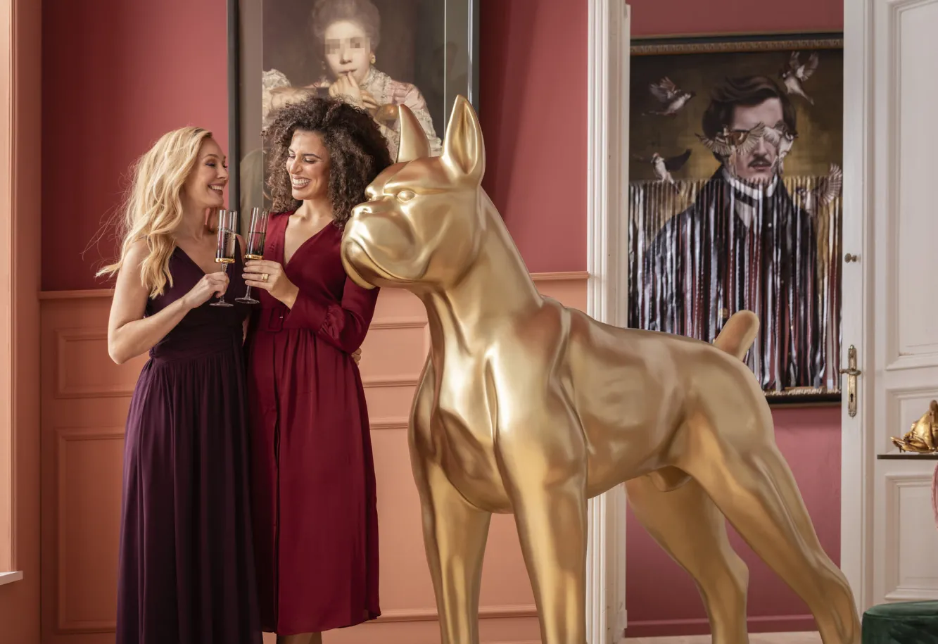 Awangardowe dekoracje stojące Toto XL oferują szeroki wybór kolorystyczny – tutaj złota figura psa o wysokości 180 cm.