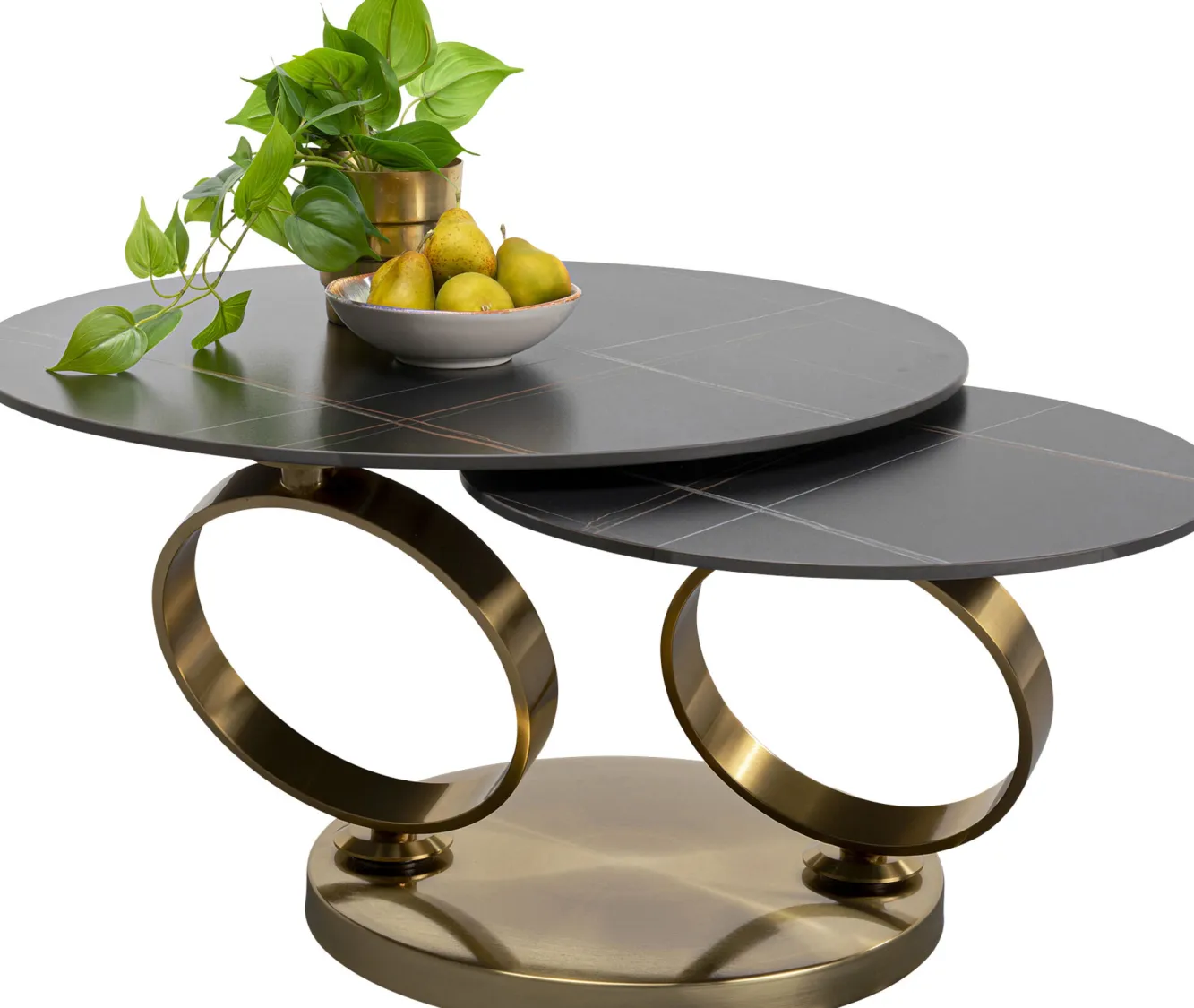 Stolik kawowy z obrotowymi okrągłymi blatami z ceramiki podstawa metalowa złota 133×80 cm
