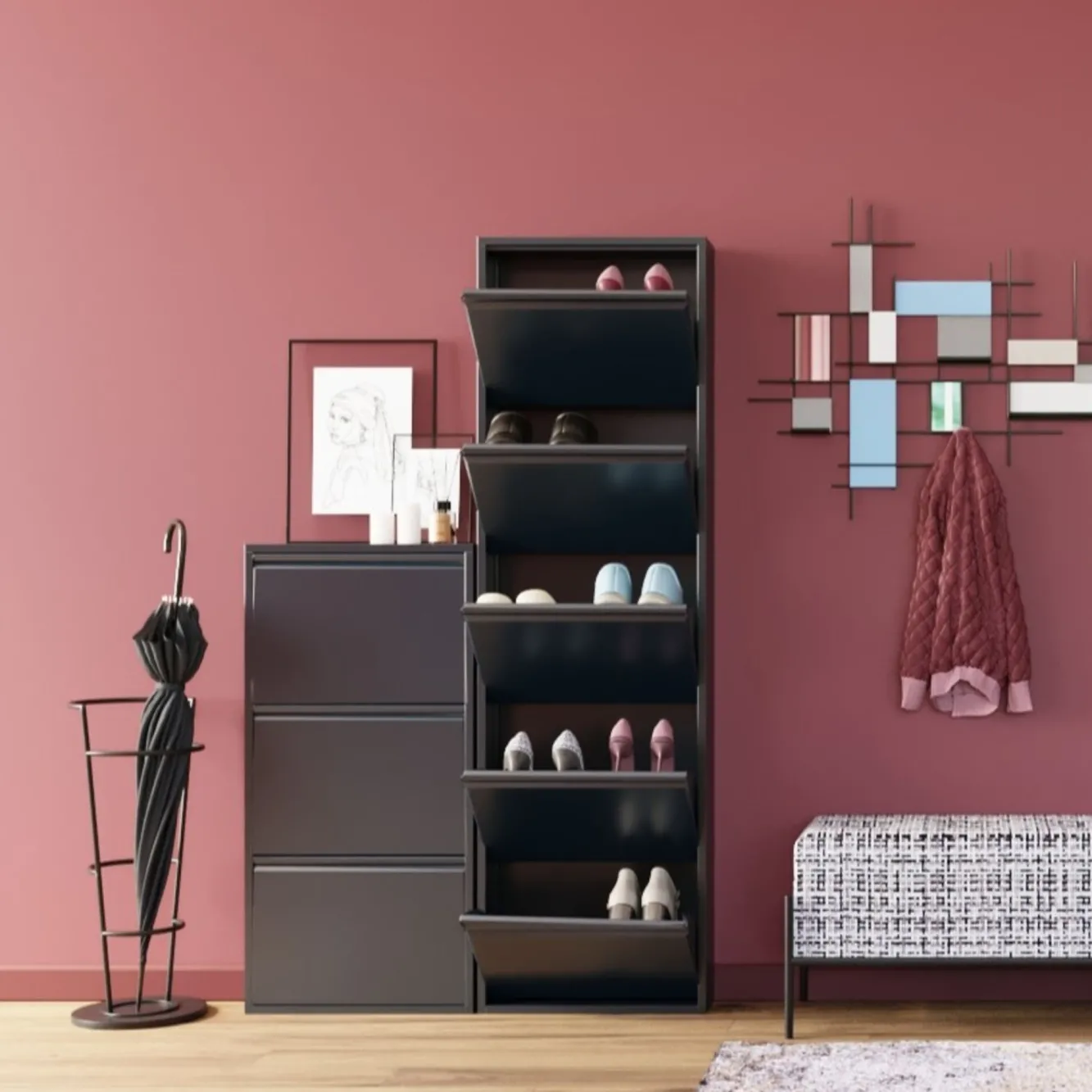 Jeśli zależy Wam na ładzie i porządku, nie zapomnijcie o aranżacyjnym niezbędniku jakim jest szafka na buty. W wyborze tej właściwej pomoże Wam wiodąca firma KARE znana z awangardowego wzornictwa o niepodrabialnym stylu. Niemiecka marka – designerski kameleon – nie samymi ekscentrycznymi kolekcjami stoi, i tutaj oddaje do Waszej dyspozycji minimalistyczną stalową szafkę na buty Caruso MO. Właściwe przechowywanie obuwia to nie jest wbrew pozorom łatwa sztuka. Źle ułożone bowiem często tracą swój pierwotny fason, na odkrytych półkach są narażone na działanie światła, kurzu, brudu i innych czynników zewnętrznych. Poza tym zajmują sporo miejsca i niejednokrotnie mamy kłopot jak i gdzie je poukładać. Idealnym rozwiązaniem jest prezentowana stalowa szafka na buty z półkami, które niczym wachlarze otwierają się udostępniając naszym butom idealne miejsce do ich przechowania. Ze względu na swoją budowę nie zajmuje obszernej części pomieszczenia, a ze względu na wygląd pięknie je ozdabia.