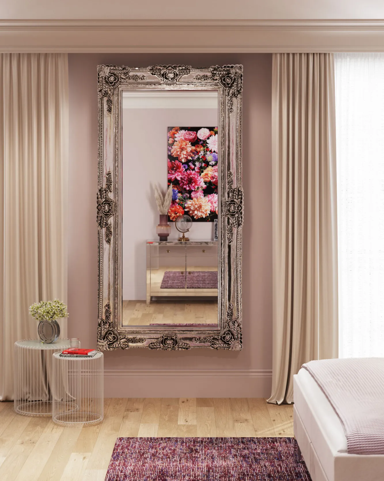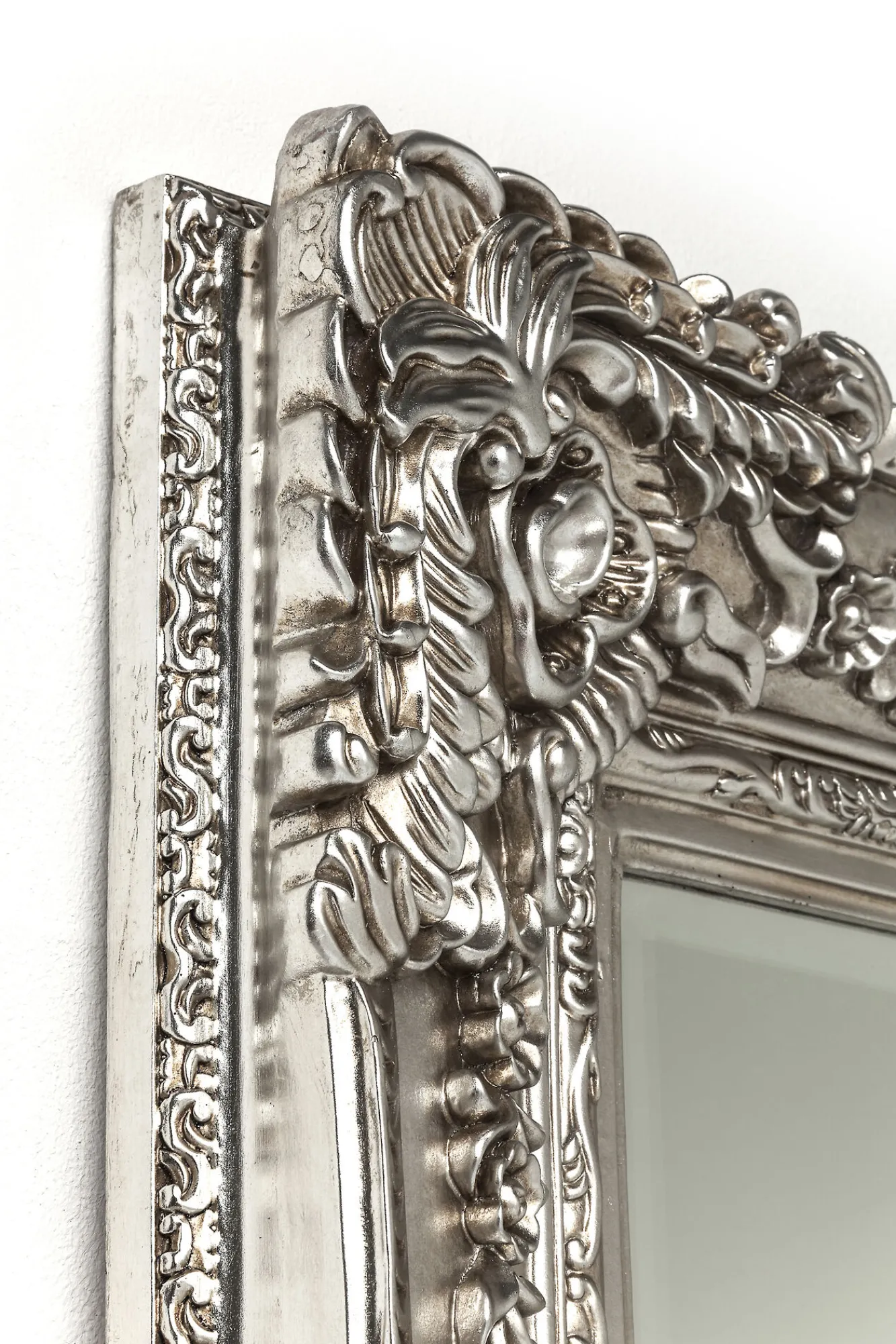 Duże lustro wiszące Royal Residence marki Kare Design w srebrnej bogato zdobionej ramie dedykowane do wnętrz inspirowanych stylem glamour.
