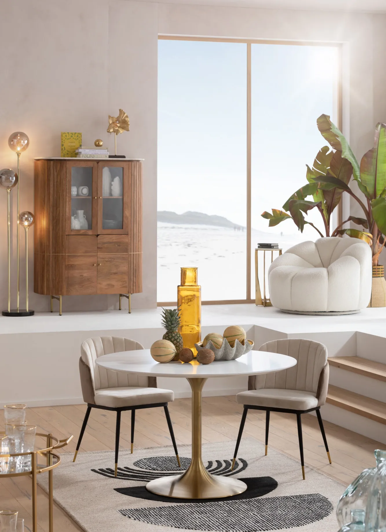 Stół Invitation Ø120 cm biały – podstawa złota Blat: płyta MDF lakierowana.Podstawa: stal nierdzewna szczotkowana.