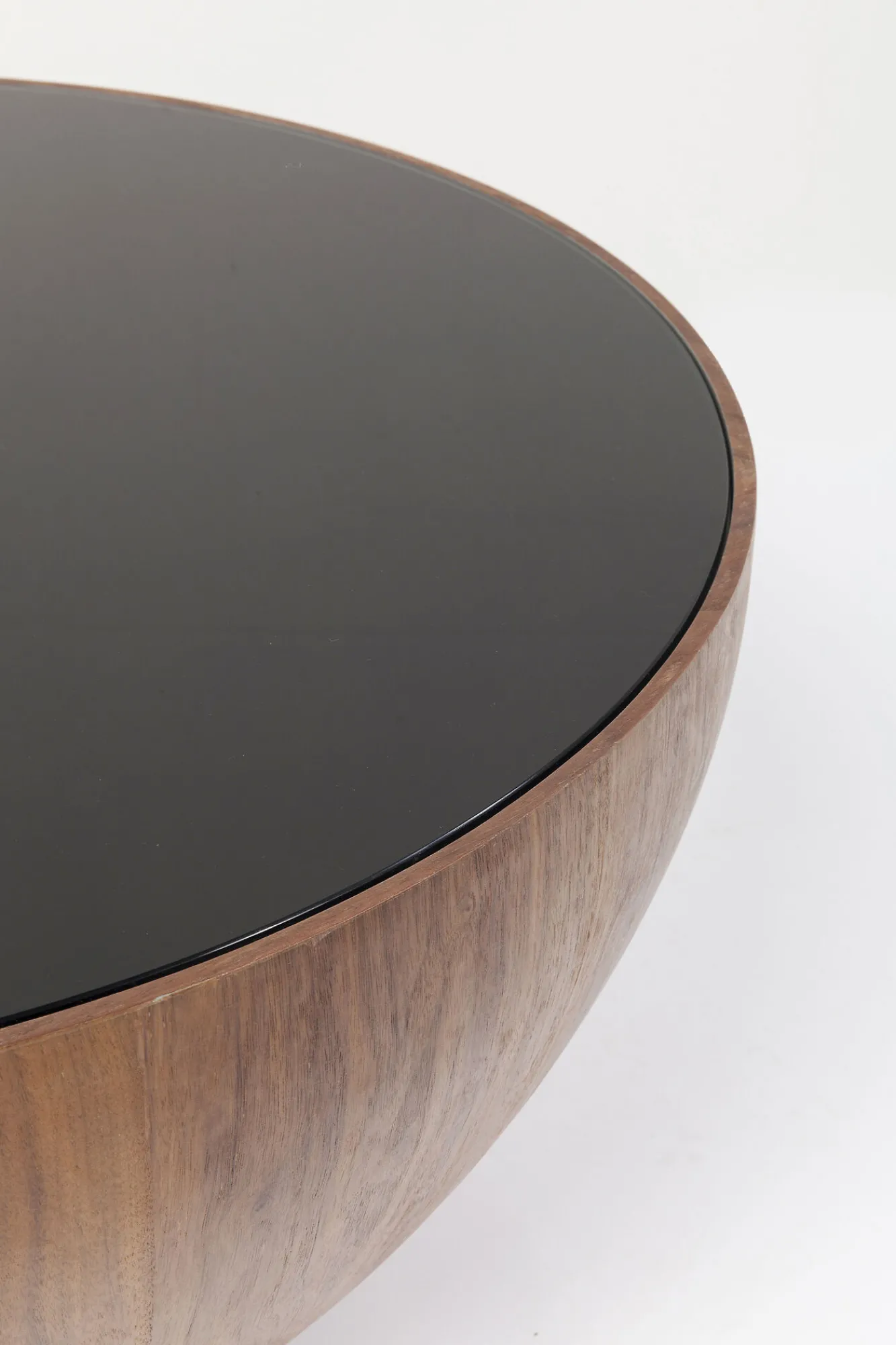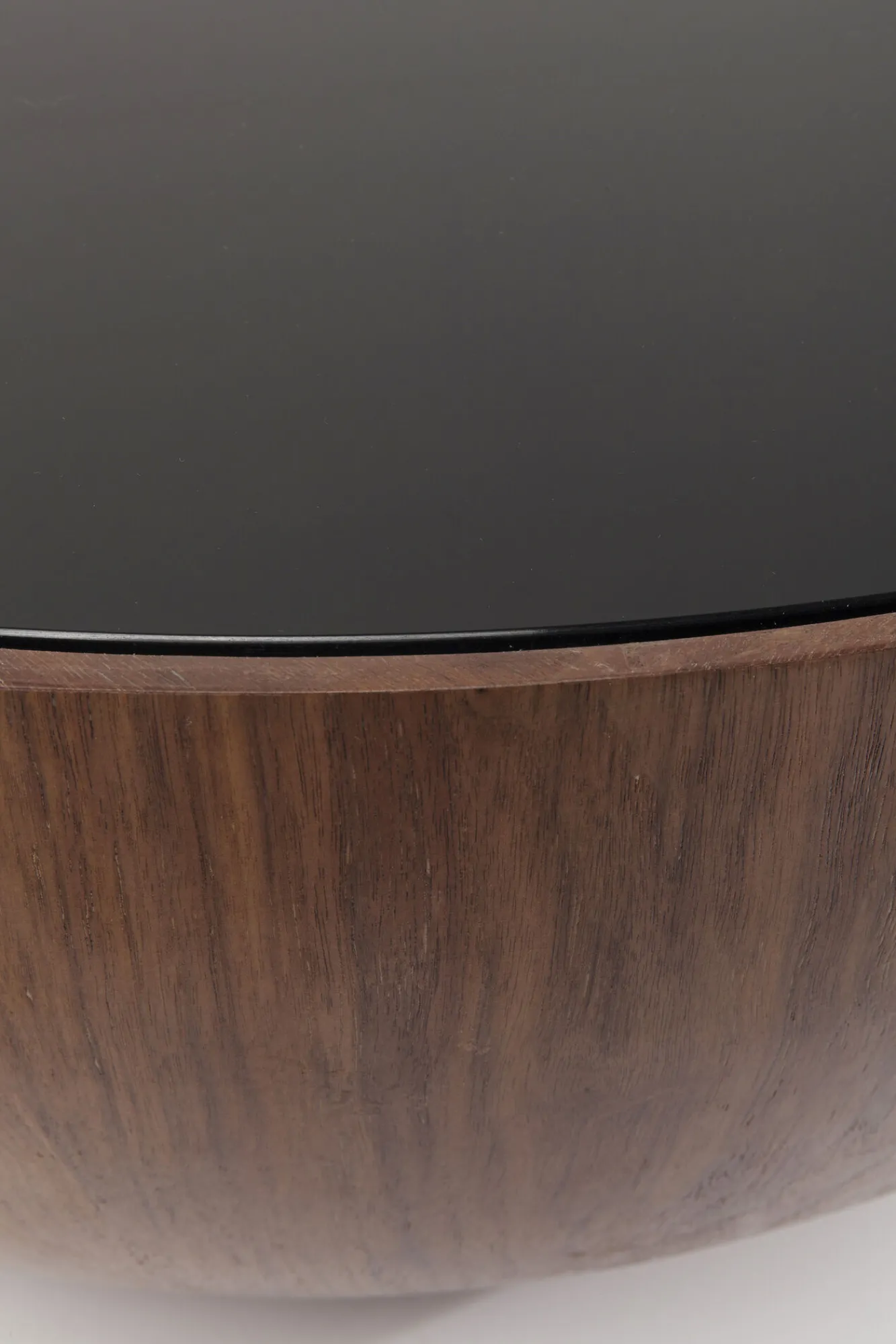 Zabawa formami geometrycznymi to zabieg, który nada twojemu wnętrzu oryginalnego charakteru. Nietypowy kształt stolika przywodzi na myśl połówkę kokosa. Dodatkowo, połączenie orzechowego koloru podstawy z czernią szklanego blatu jest klasyczne i eleganckie. Do wykonania stolika użyto szkła oraz fornirowanej płyty MDF. Wymiary to 80×35 cm (średnica x wysokość).