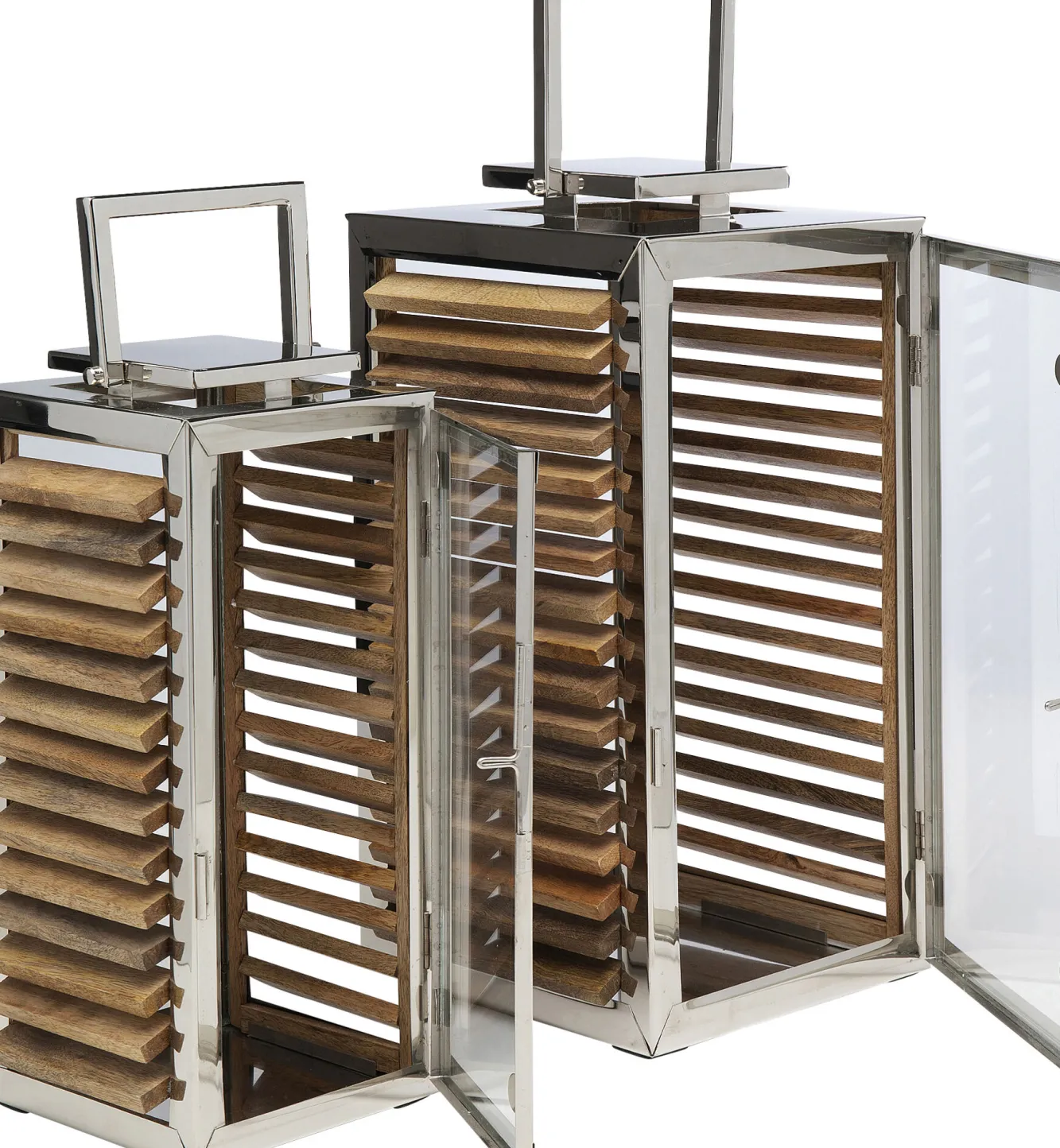 Zestaw 2 dużych latarenek ze stali nierdzewnej i drewna mango