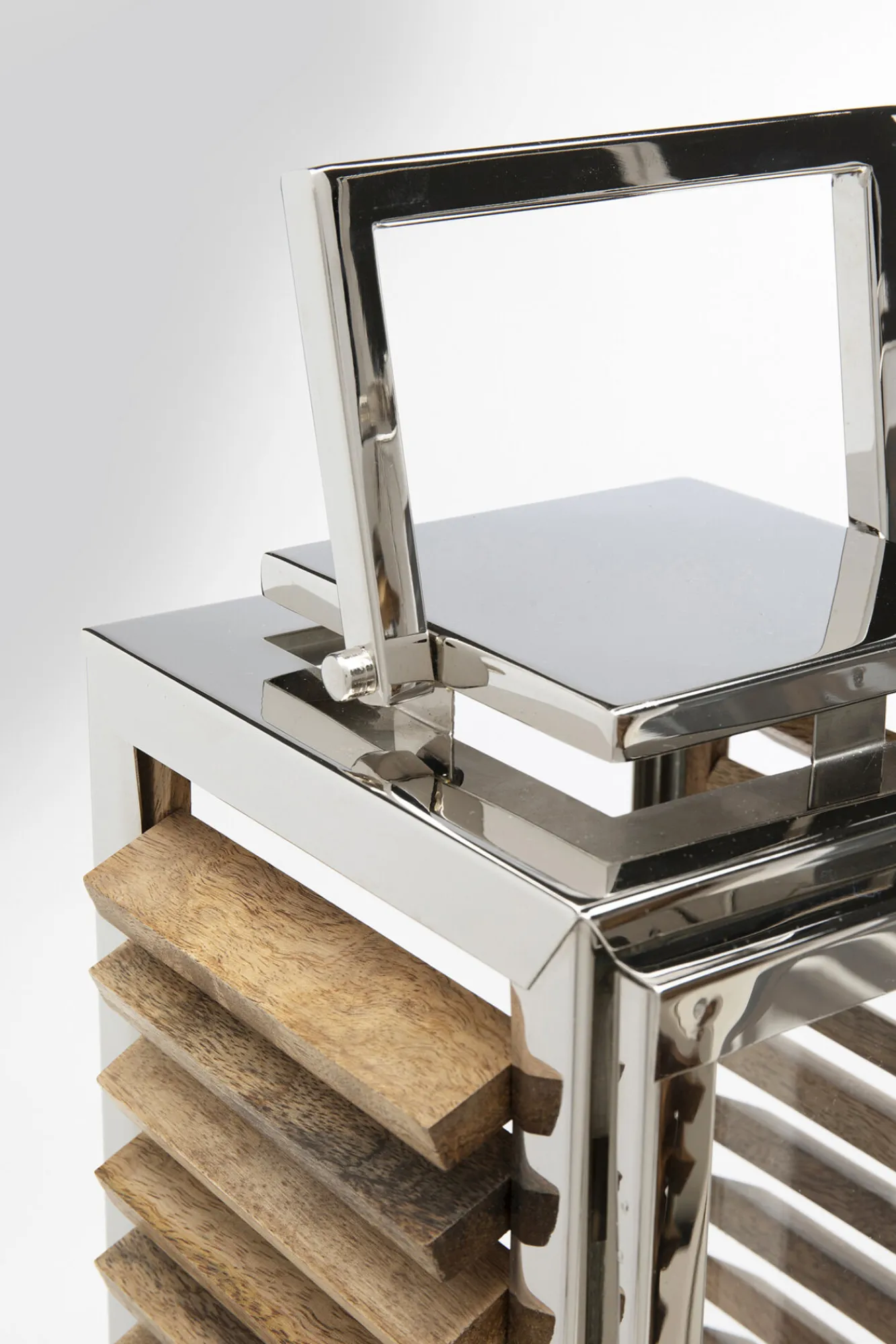 Materiały: szkło transparentne, drewno mango, stal nierdzewna niklowana.