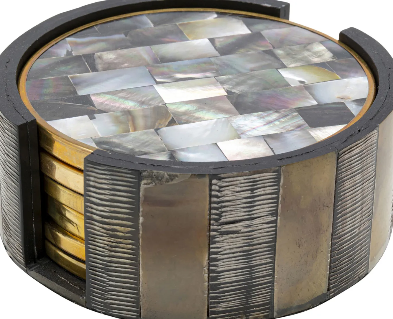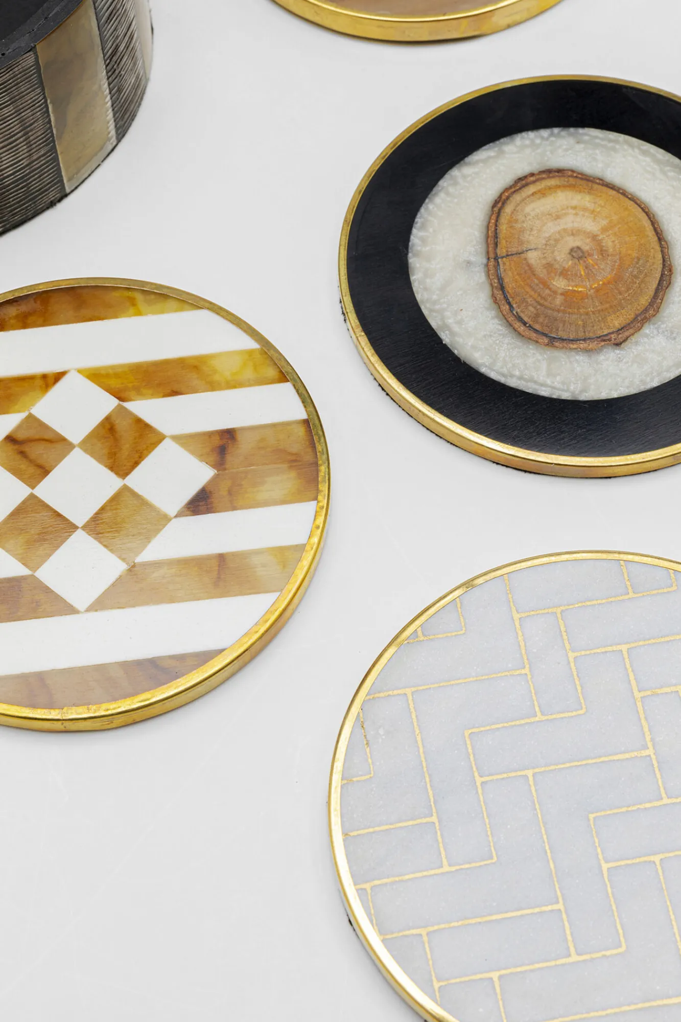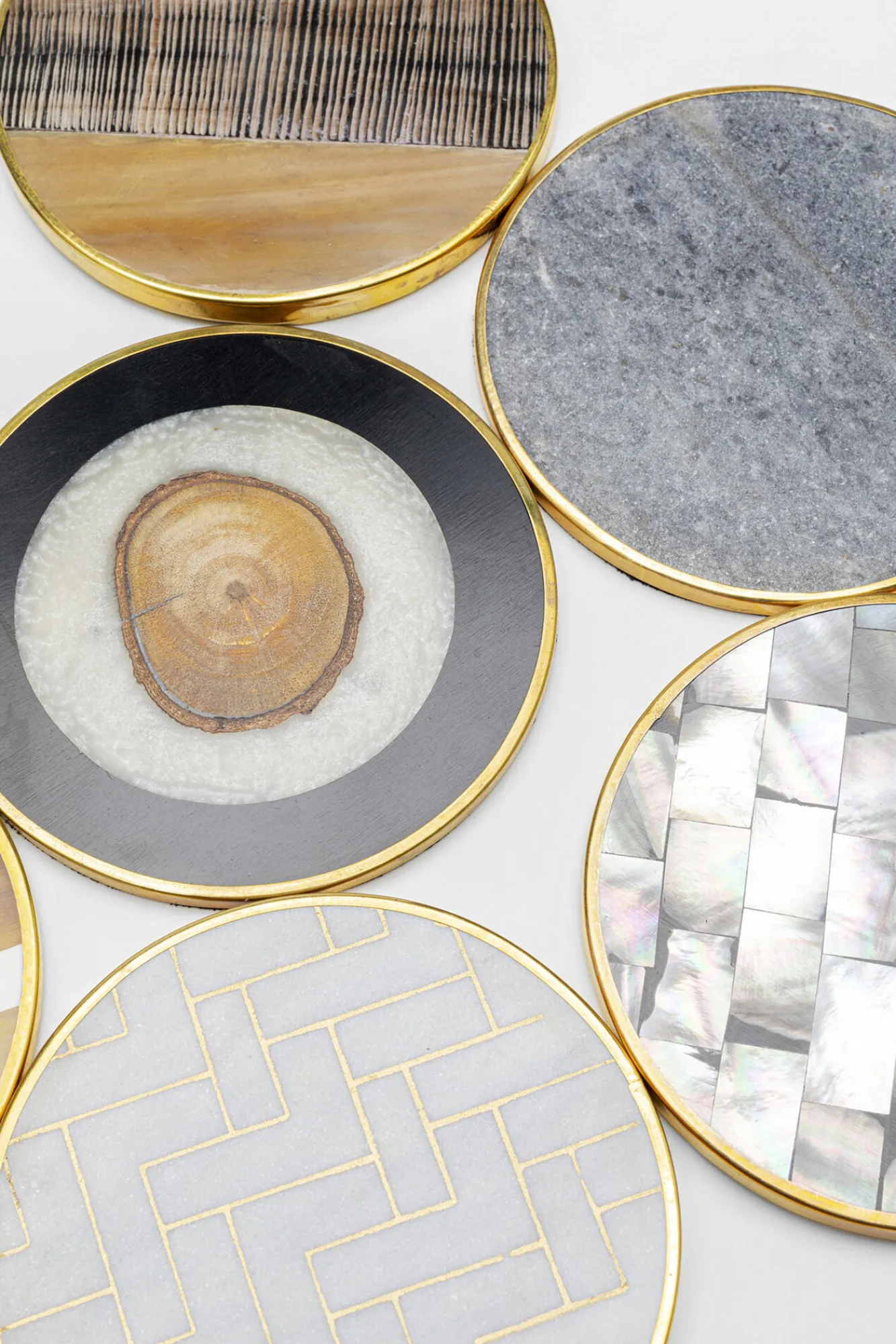 Zestaw 6 podkładek okrągłych pod kubki kolorowe z organizerem Ø11 cm Materiały: mosiądz szczotkowany (krawędzie),…