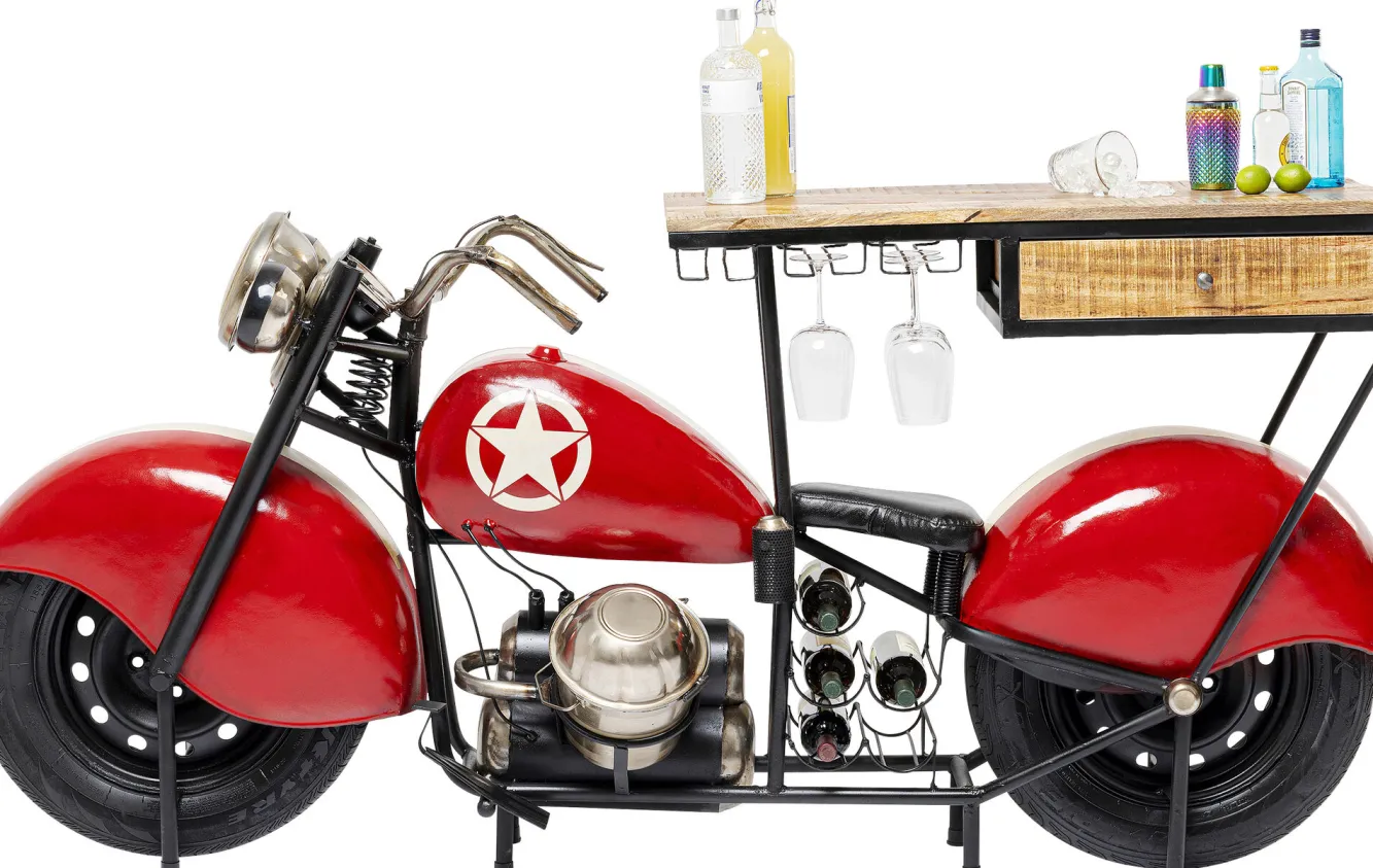 Barek motocykl czerwony vintage 210×98 cm blat drewno mango Korpus: stal lakierowana.Blat, szuflada: drewno mango lakier…