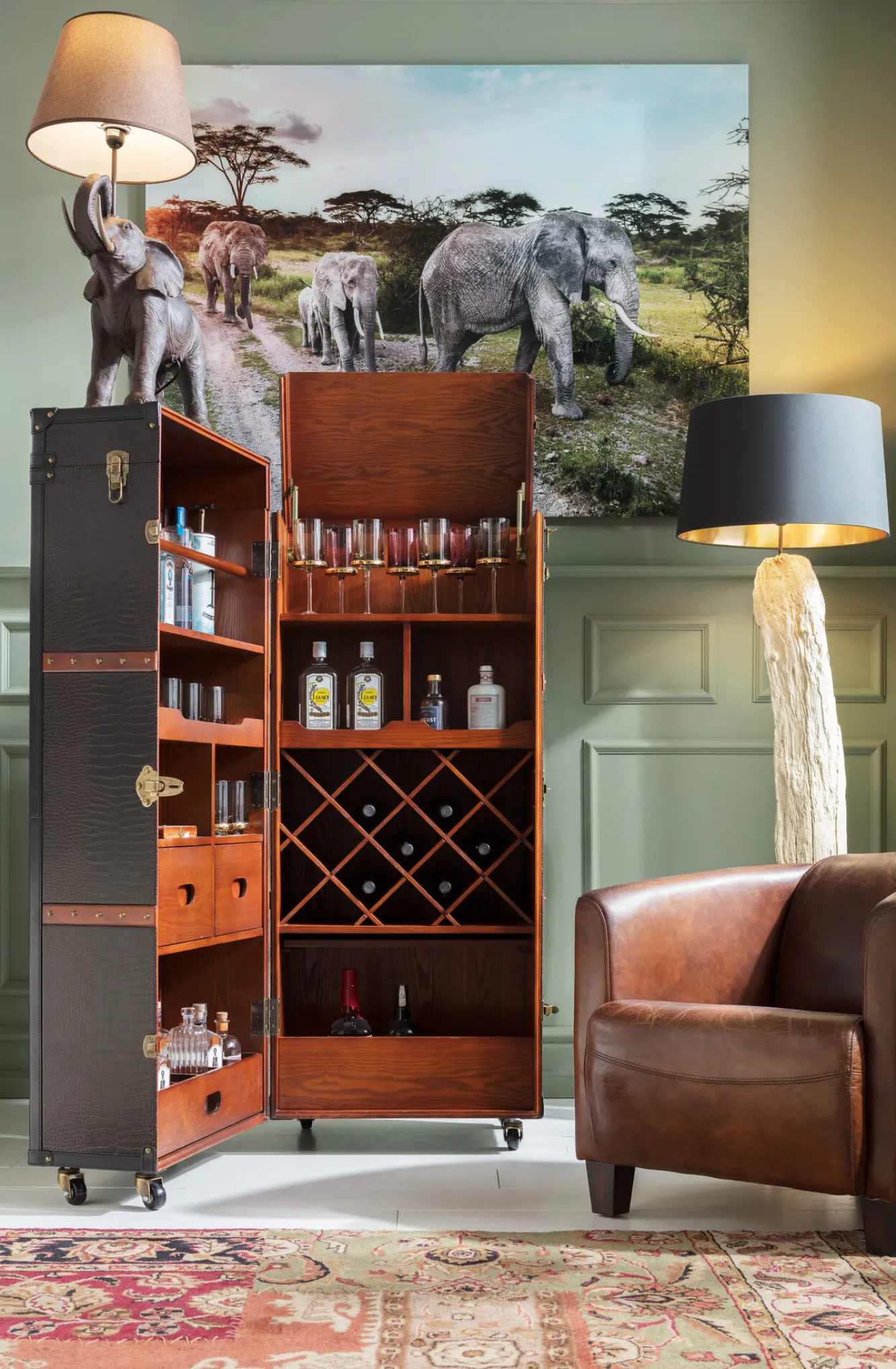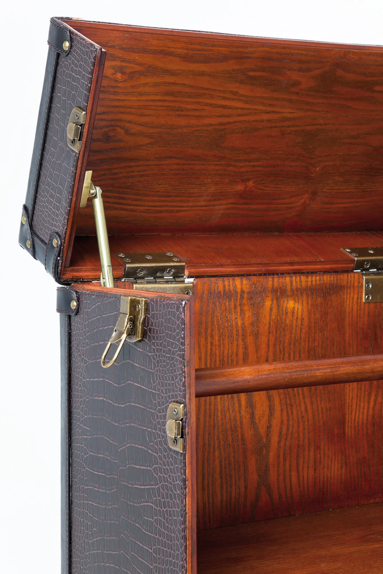 Barek rozkładany skrzynia na kółkach czarno-brązowy 60×153 cm Materiały: poliester (tył), poliuretan, MDF, fornir …