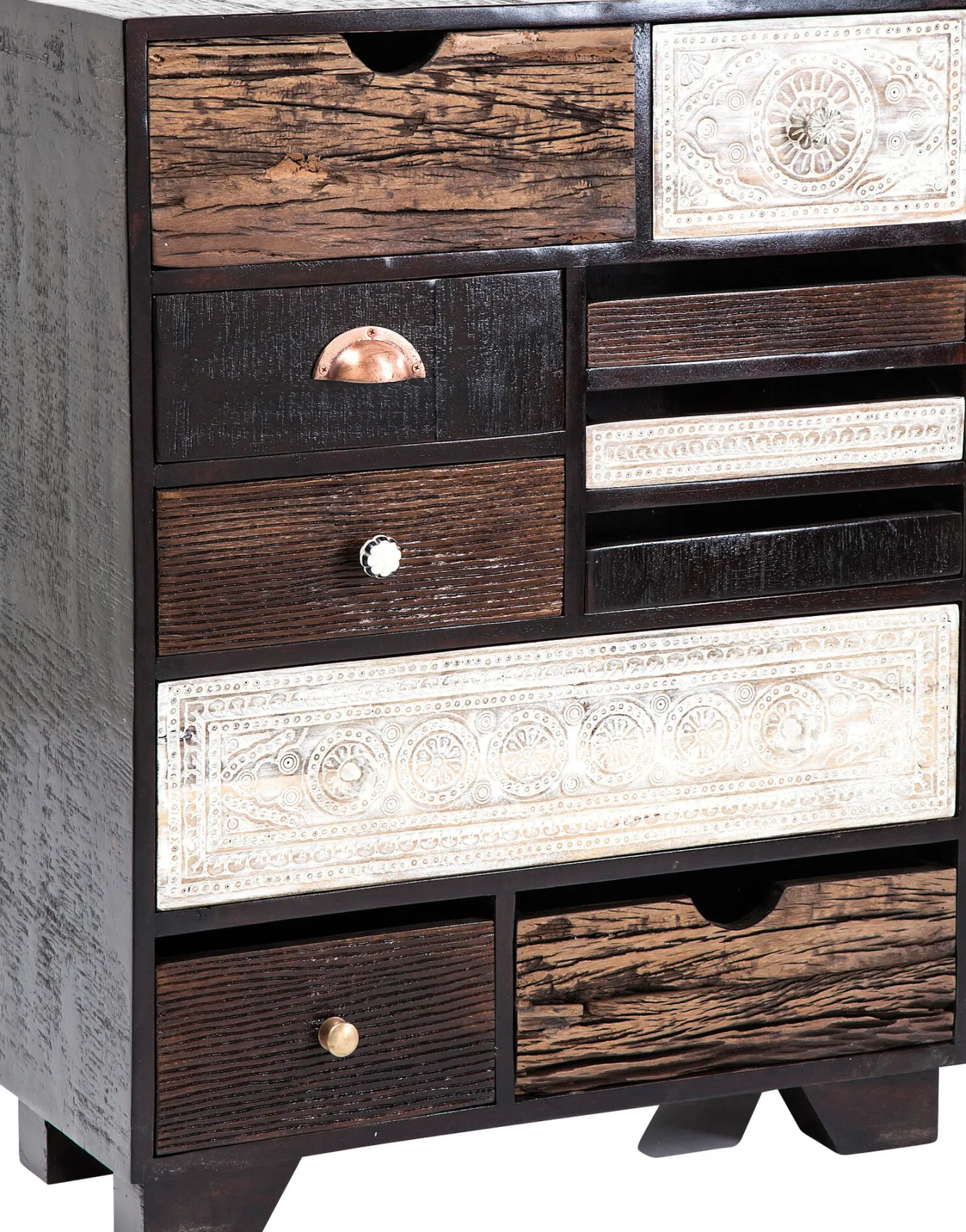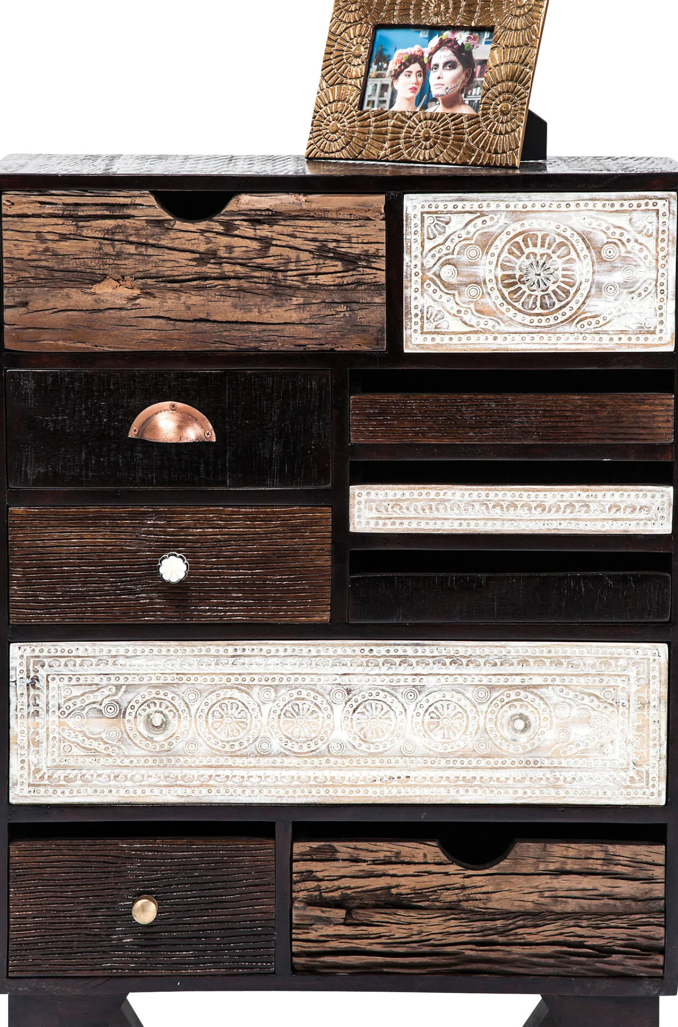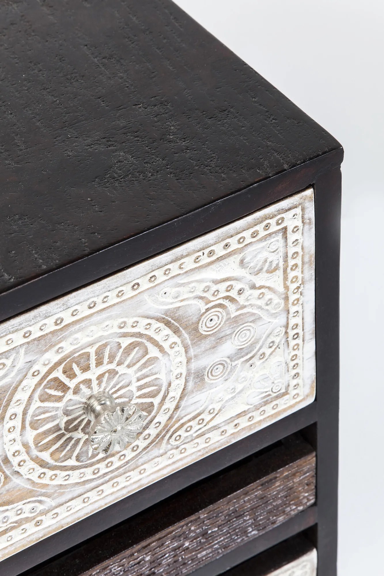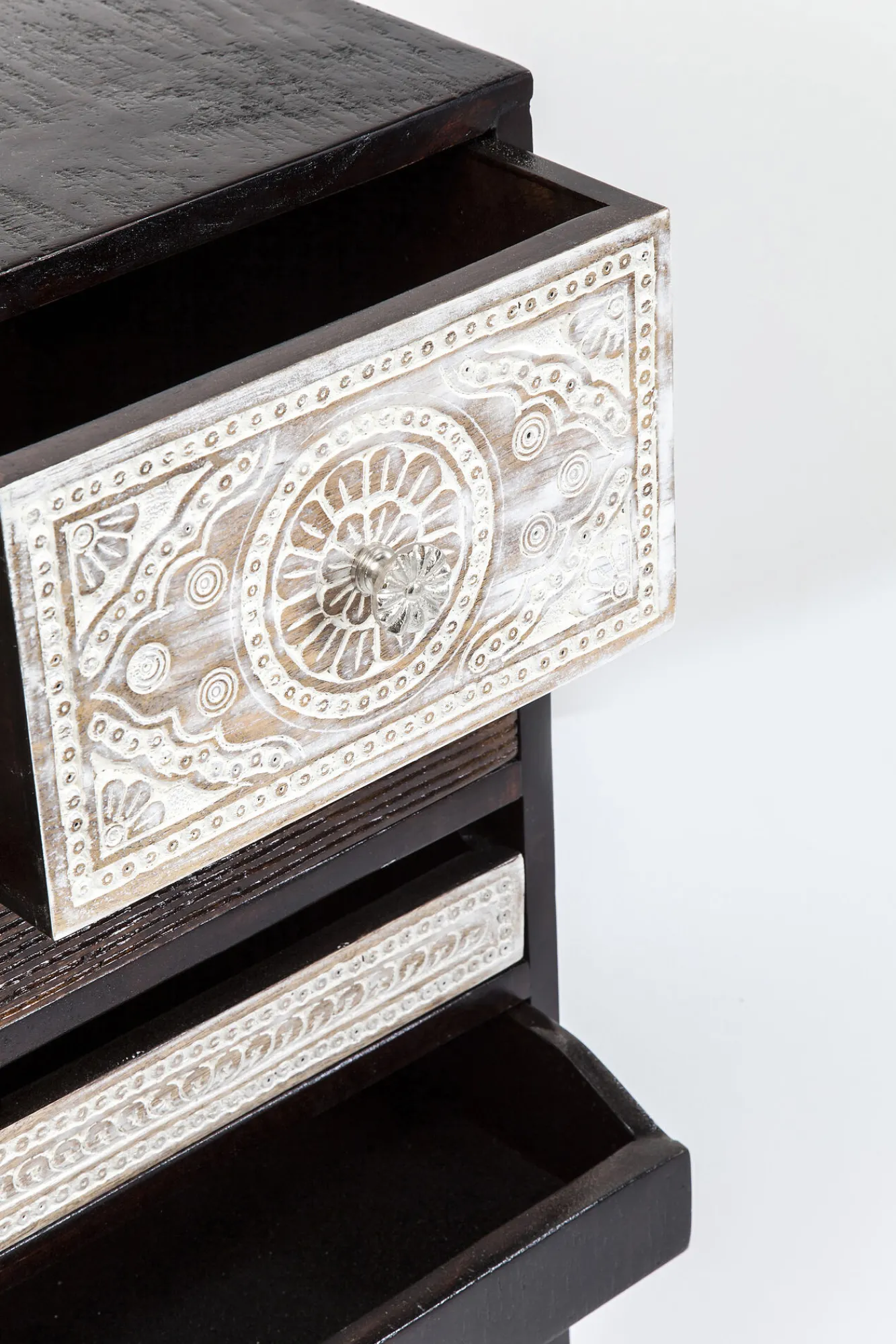 Ciemnobrązowa komoda drewniana w stylu industrialnym Finca jest jednocześnie nowoczesna i romantyczna. Do naszej oferty wkracza za pośrednictwem wizjonerskiej firmy KARE, słynącej z niepodrabialnego designu. Niemiecka marka powołuje się na rozmaite inspiracje, nie lubi się powtarzać i mówi stanowcze NIE bylejakości oraz przeciętności. W tym przypadku producent odsłania przed Wami mebel, który spełni Wasze zarówno estetyczne, jak i praktyczne wymogi i pozwoli na nowo tchnąć życie w Wasz wystrój wnętrza. Prezentowana komoda ciemnobrązowa charakteryzuje się dekoracyjnymi frontami inspirowanymi wschodnią ornamentyką. Finezyjne, niebanalne wzornictwo idzie tutaj w parze z wysoką funkcjonalnością. Unikatowa oraz pełna harmonii komoda drewniana odpowiada licznym współczesnym rozwiązaniom we wnętrzarstwie.