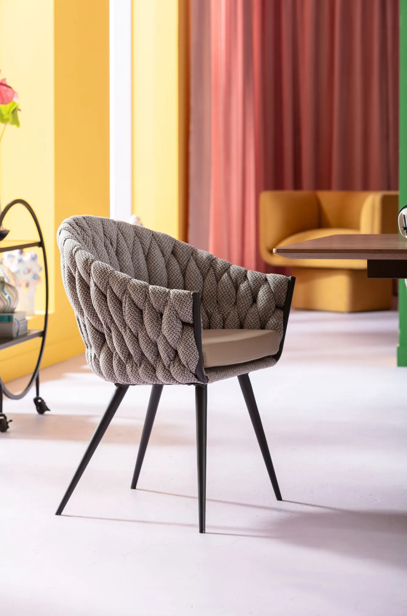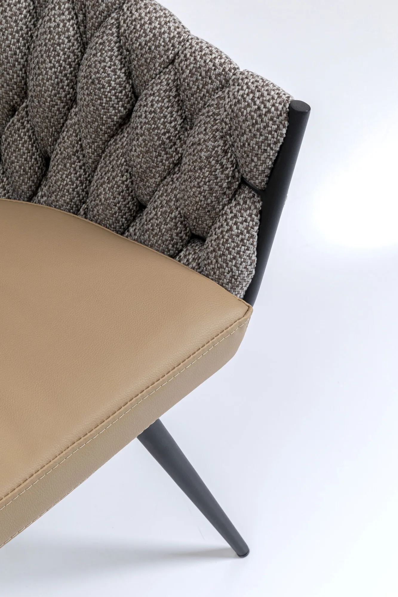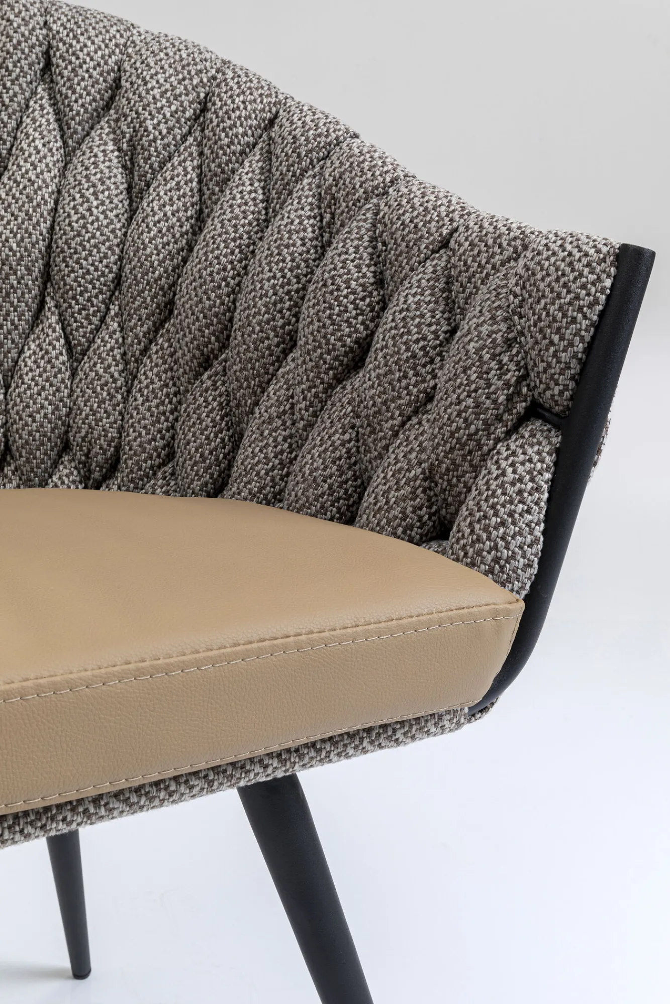 Nowoczesne krzesła z podłokietnikami w stylu glamour z serii Knot oferują szeroki wybór kolorystyczny – tutaj brązowe krzesło tapicerowane z podłokietnikami.