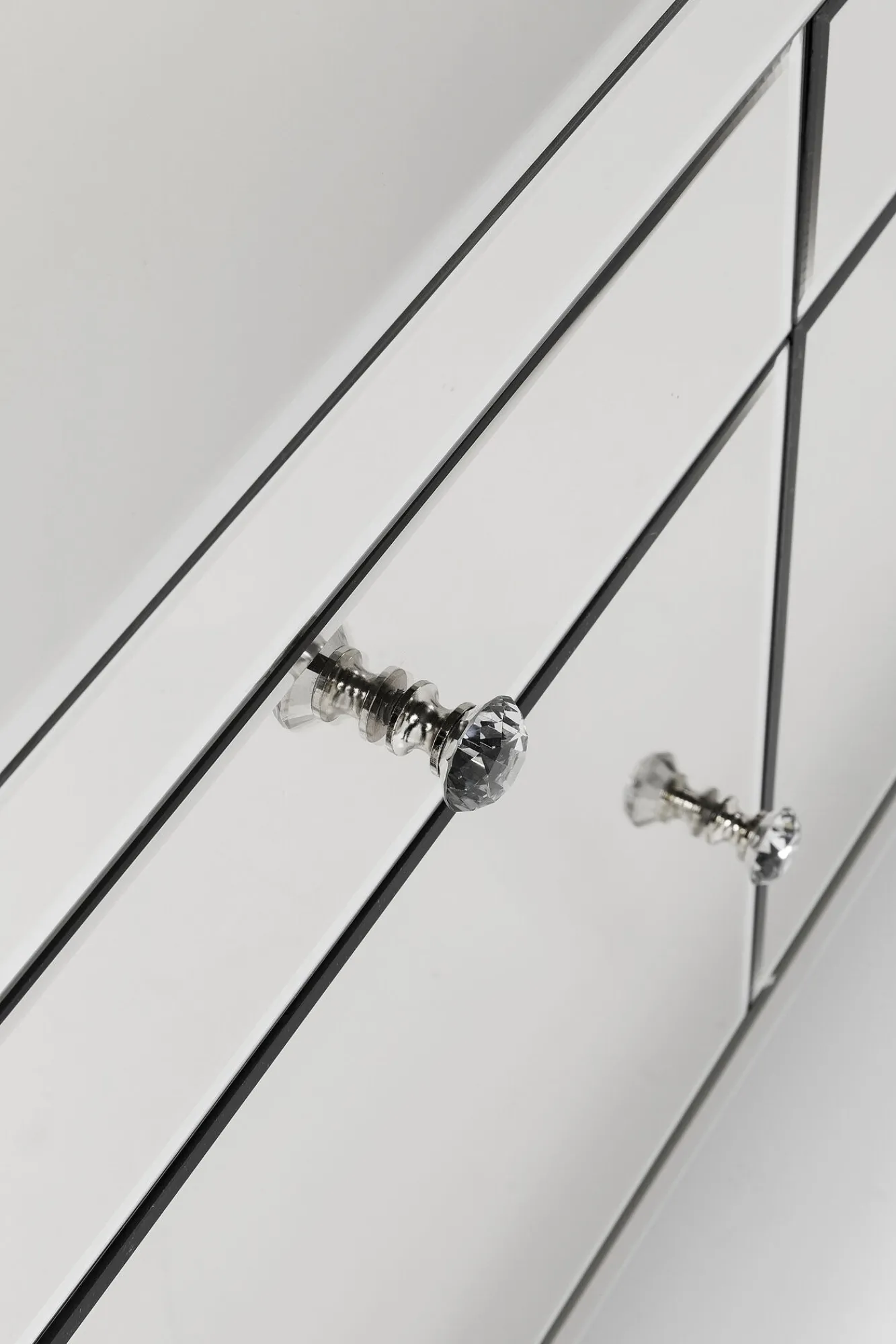 Seria nowoczesnych mebli ze szkła w stylu glamour Luxury oferuje szeroki wybór wyposażenia wnętrz – tutaj lustrzana komoda 3 szufladowa i 3 drzwiowa.