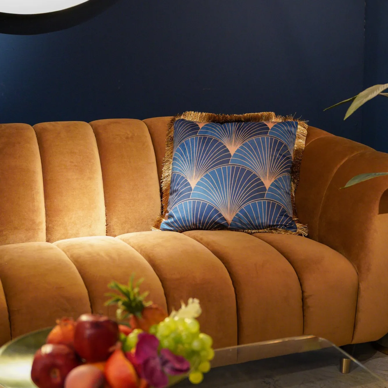 Poduszka dekoracyjna z frędzlami 45×45 cm niebieska liście